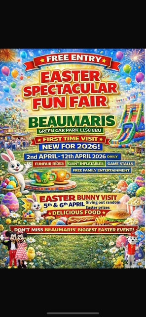 Beaumaris Fun Fair - This Easter fun fair will be in place from the 2nd to the 12th of April on Beaumaris green providing rides, giant inflatables, classic fun fair games and free entertainments. Don't forget to check out all of the fantastic local shops and eateries after the fun of the fair!